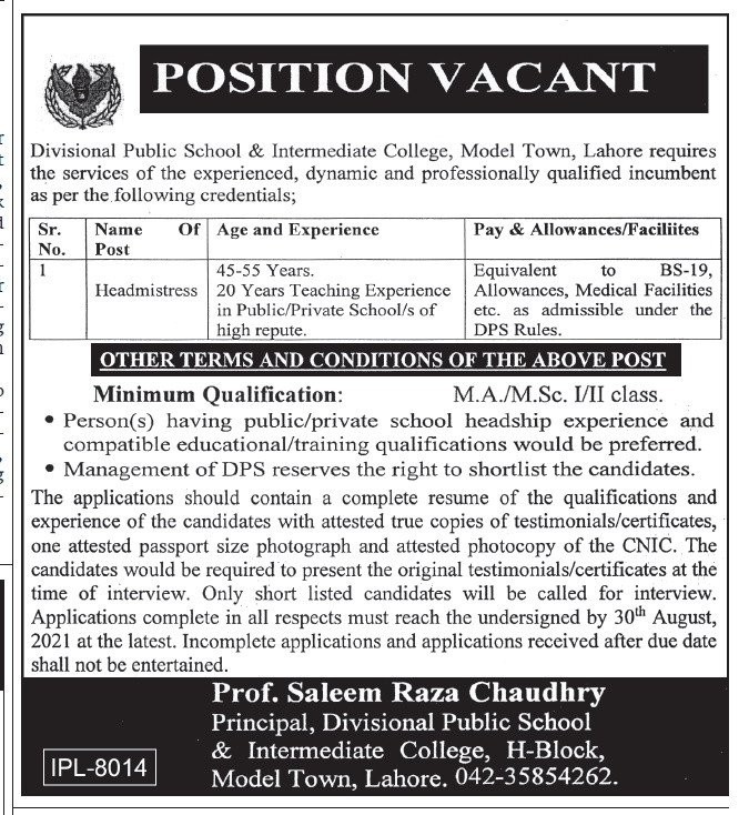 Divisional Public School & Intermediate College Jobs, Management Positions August 2021