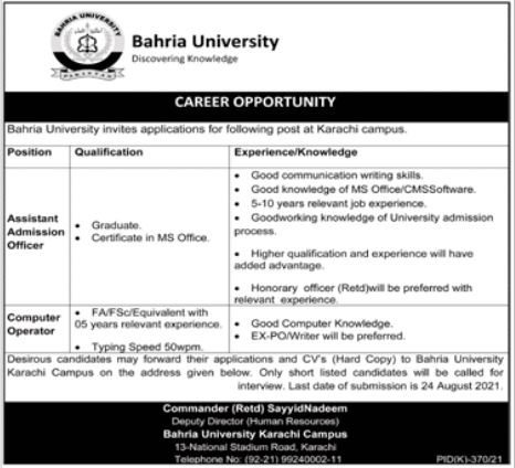Bahria University Jobs, Management Positions August 2021