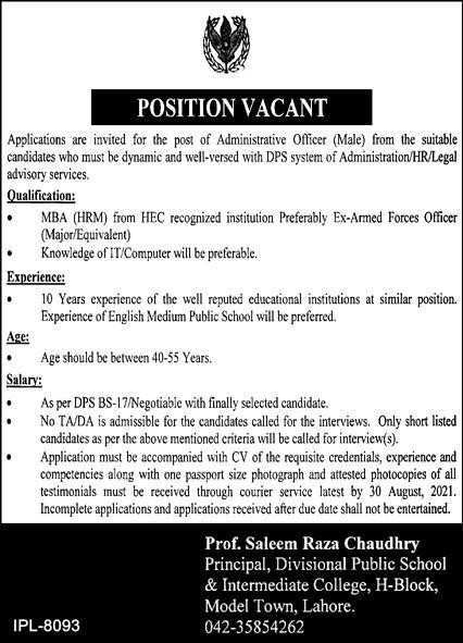 Divisional Public School & Intermediae College Jobs, Management Positions August 2021