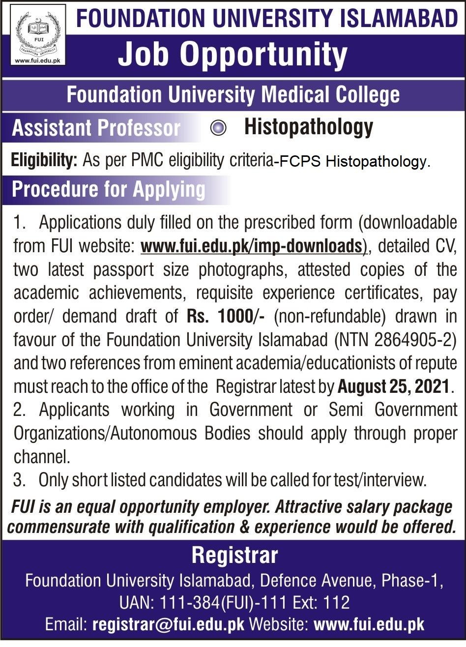 1. Applications duly filled on the prescribed form (downloadable from FUI website: www.fui.edu.pk/imp-downloads), detailed CV, two latest passport size photographs, attested copies of the academic achievements, requisite experience certificates, pay order/ demand draft of Rs. 1000/- (non-refundable) drawn in favour of the Foundation University Islamabad (NTN 2864905-2) and two references from eminent academia/educationists of repute must reach to the office of the Registrar latest by August 25, 2021.