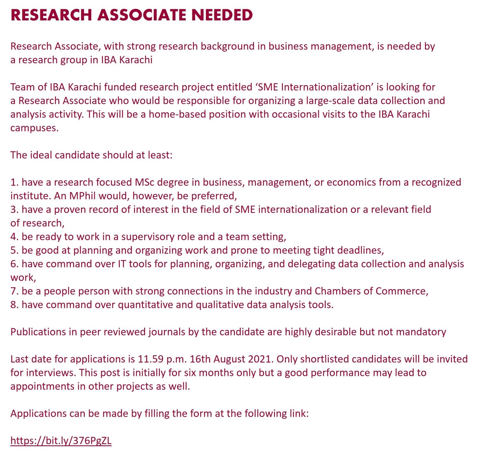 Team of IBA Karachi funded research project entitled 'SME Internationalization' is looking for a Research Associate who would be responsible for organizing a large-scale data collection and analysis activity. This will be a home-based position with occasional visits to the IBA Karachi campuses.