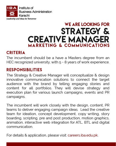 CRITERIA The incumbent should be a have a Master’s degree from an HEC recognized university. With 5 - 8 years of work experience. RESPONSIBILITIES The Strategy & Creative Manager will conceptualize & design innovative communication solutions to connect the target audience with the brand by telling engaging stories and content for all portfolios. They will devise strategy and execution plan for various Launch campaigns. Events and PR campaigns.