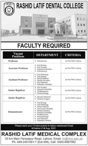 Rashid Latif Medical College Jobs, Teaching/Faculty & Management Positions August 2021