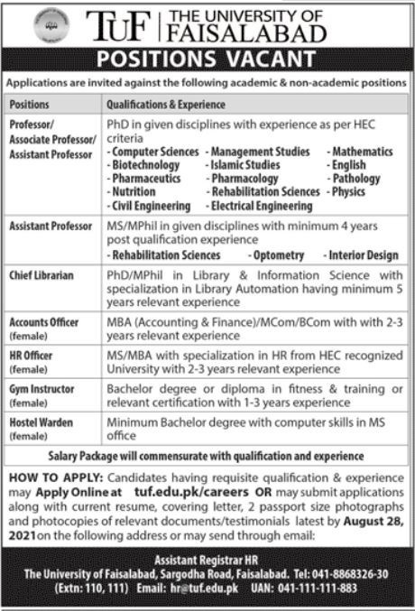 The University of Faisalabad Jobs, Teaching/Faculty & Management Positions August 2021