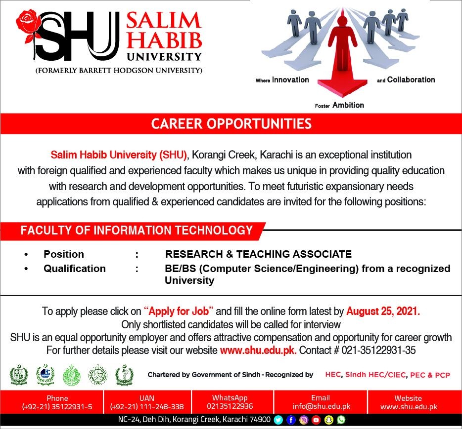 To apply please click on "Apply for Job.. and fill the online form latest by August 25, 2021. Only shortlisted candidates will be called for interview SHU is an equal opportunity employer and offers attractive compensation and opportunity for career growth For further details please visit our website www.shu.edu.pk. Contact # 021-35122931-35