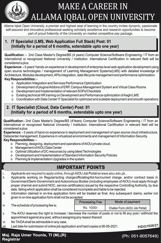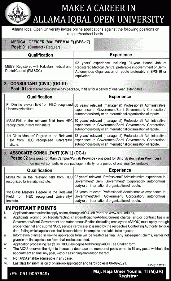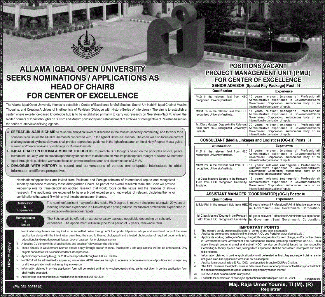 Allama Iqbal Open University Jobs, Management Positions August 2021