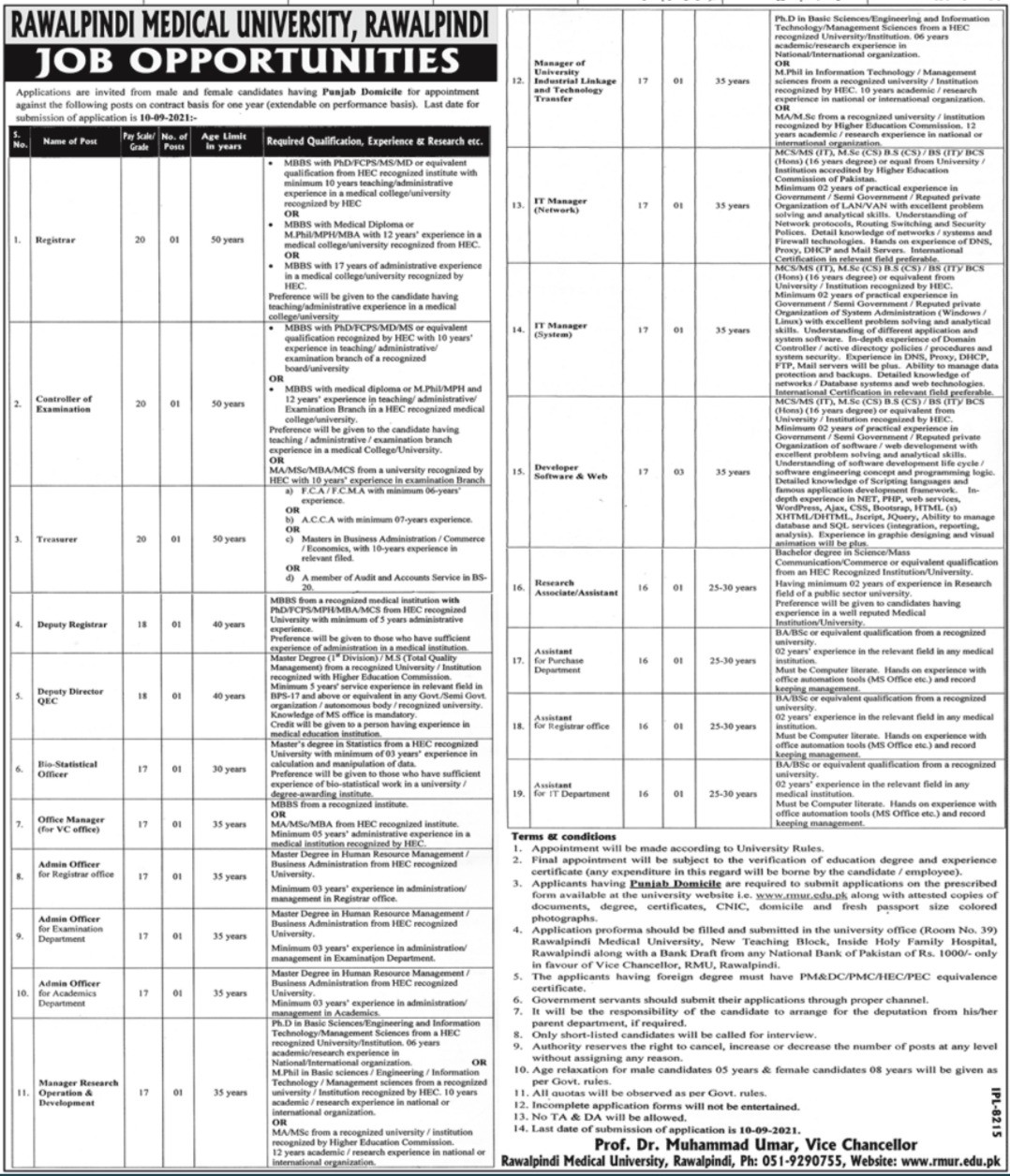 Rawalpindi Medical University Jobs, Management Positions August 2021