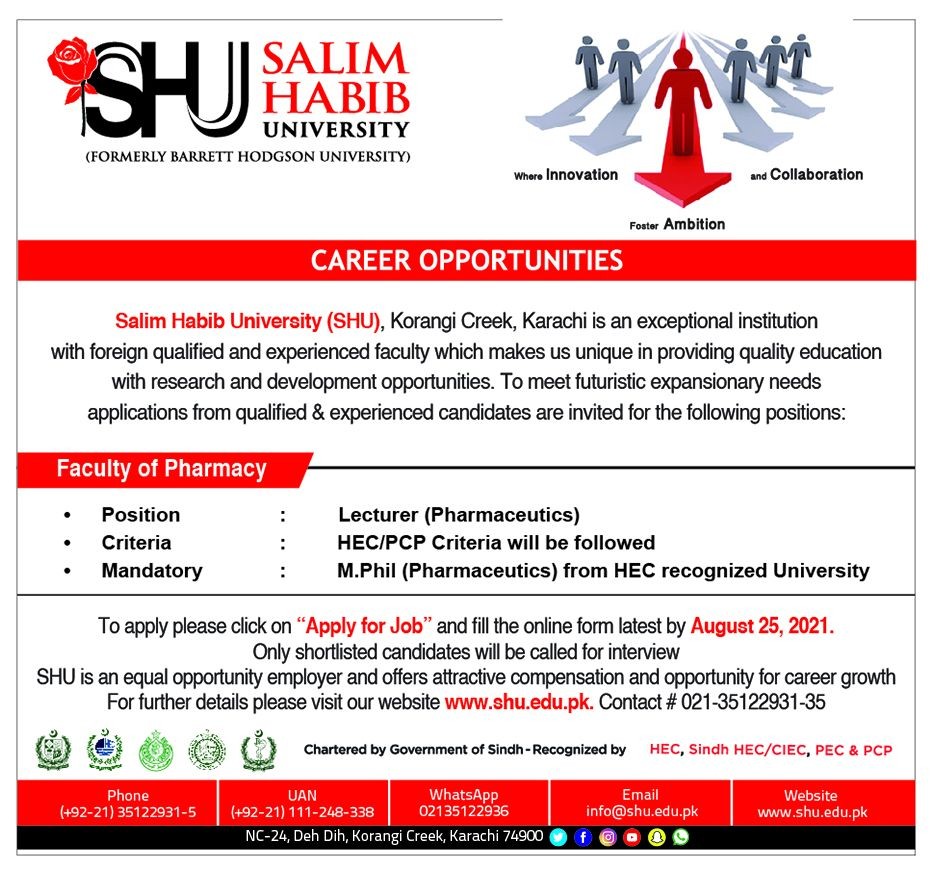 To apply please click on "Apply for Job" and fill the online form latest by August 25, 2021. Only shortlisted candidates will be called for interview SHU is an equal opportunity employer and offers attractive compensation and opportunity for career growth For further details please visit our website www.shu.edu.pk. Contact # 021-35122931-35