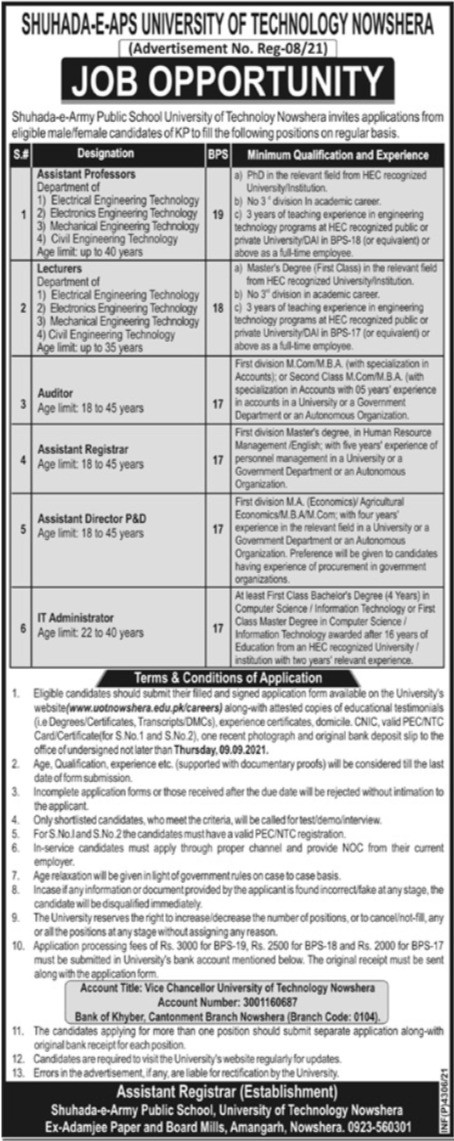 University of Technology Noshera Jobs, Teaching/Faculty & Management Positions August 2021