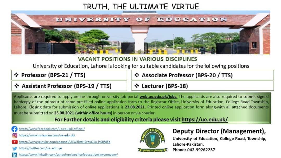 lints are required to apply online through university job portal web.ue.edu.pk/lobs. The applicant. are also required to submit y of the printout of same pre-filled online application form to the Registrar Office, University of Education, College Road Town . Closing date for submission of online applications is 23.08.2021. Printed online application form along-with all attached document be submitted on 25.08.2021 (within office hours) in person or via courier. For Further details and eligibility criteria please visit https://ue.edu.pk/