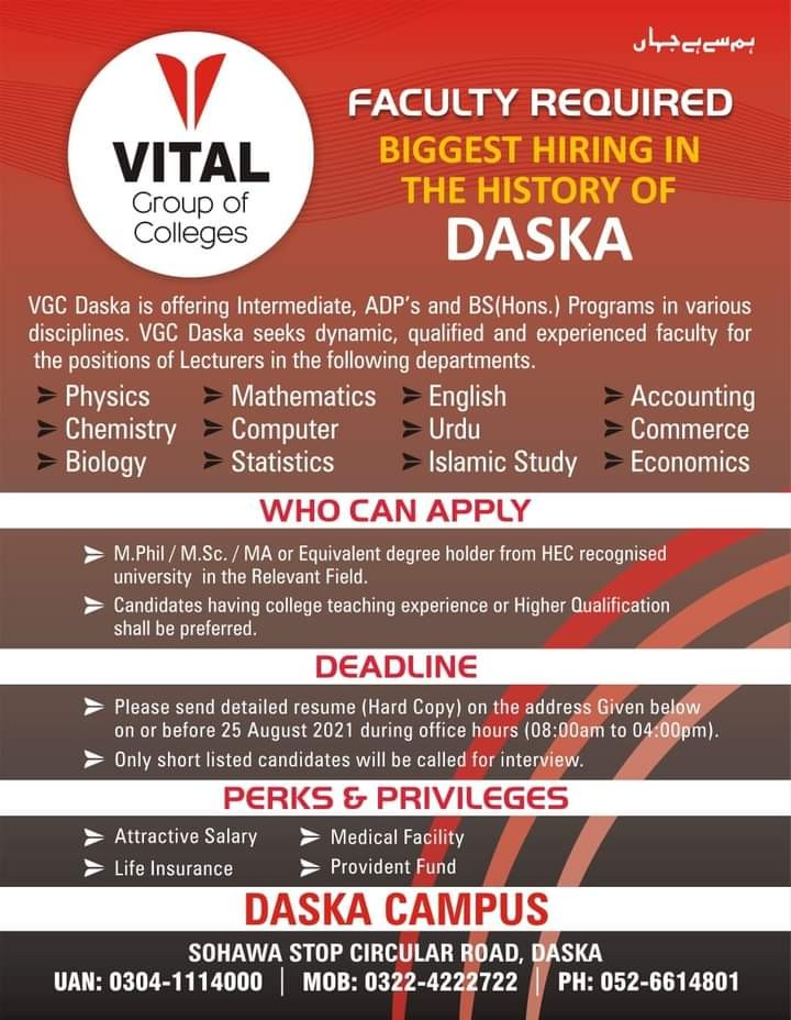 Vital Group of Colleges Jobs, Teaching/Faculty Positions August 2021