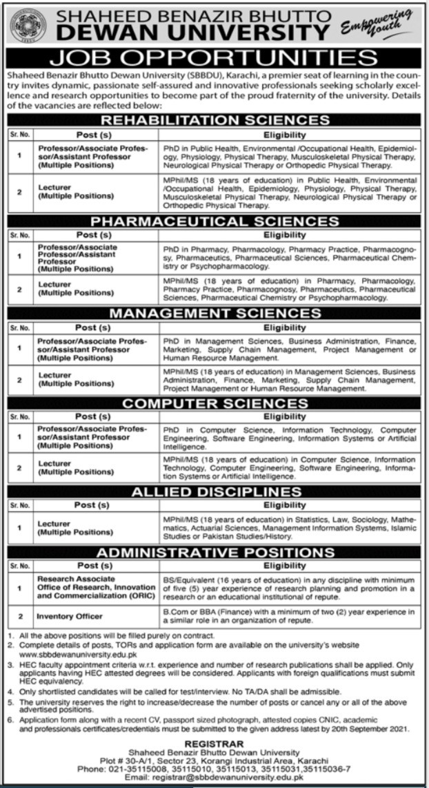 SBB Dewan University Jobs, Teaching/Faculty & Management Positions August 2021