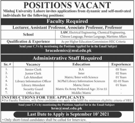 Minhaj University Lahore Jobs, Teaching/Faculty & Management Positions August 2021
