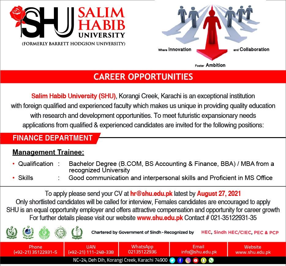 To apply please send your CV at hr@shu.edu.pk latest by August 27, 2021 Only shortlisted candidates will be called for interview, Females candidates are encouraged to apply SHU is an equal opportunity employer and offers an attractive compensation and opportunity for career growth For further details please visit our website www.shu.edu.pk Contact # 021-35122931-35 0: Chartered by Government of Sindh - Recognized by HEC, Sindh HEC/CIEC, PEC & PCP