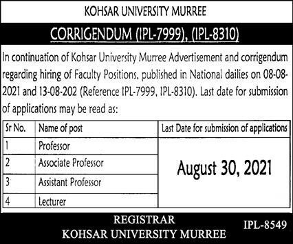 In continuation of Kohsar University Murree Advertisement and corrigendum regarding hiring of Faculty Positions, published in National dailies on 08-08-2021 and 13.08-202 (Reference IPL-7999, IPL-8310). Last date for submission of applications may be read as: