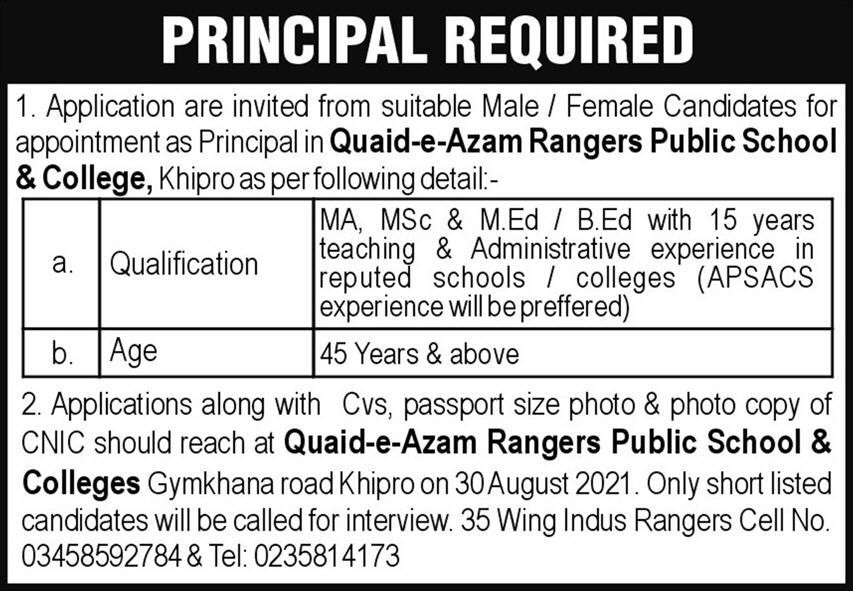 1. Application are invited from suitable Male / Female Candidates for appointment as Principal in Quaid-e-Azam Rangers Public School & College, Khipro as per following detail:-