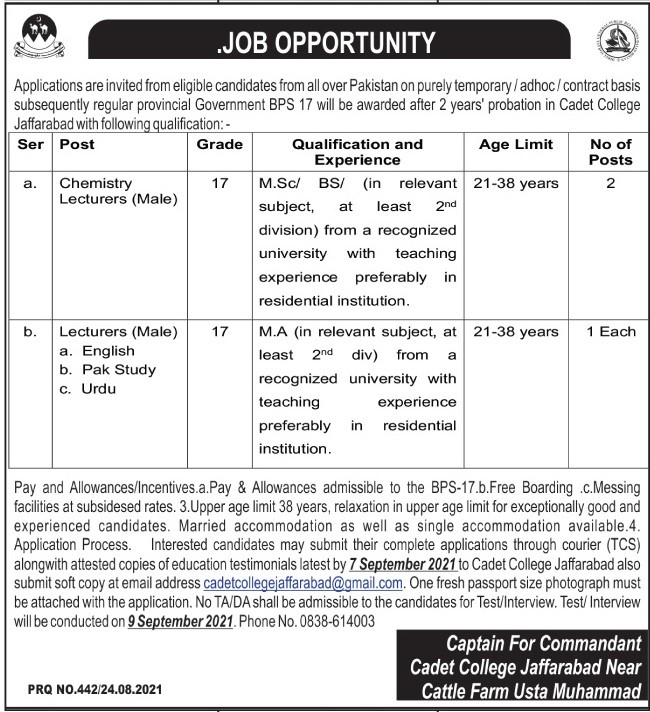 Applications are invited from eligible candidates from all over Pakistan on purely temporary ladhocl contract basis subsequently regular provincial Government BPS 17 will be awarded after 2 years' probation in Cadet College Jaffarabad with following qualification:-