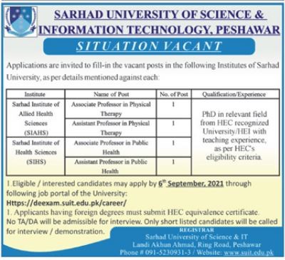 Sarhad University of Science & Information Technology Jobs, Teaching/Faculty Positions August 2021