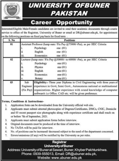 University Of Buner Jobs, Teaching/Faculty Positions August 2021