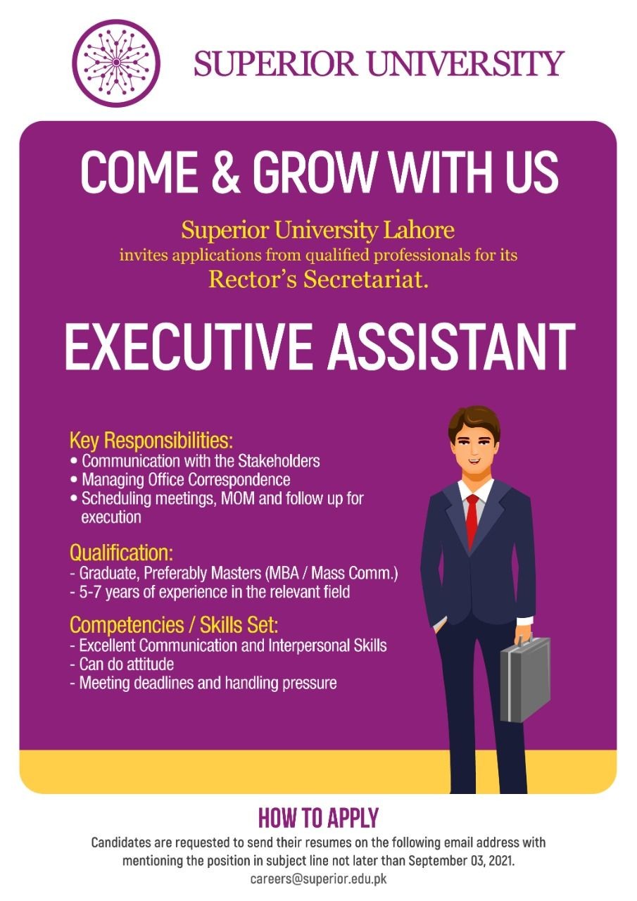 Superior University Lahore invites applications from qualified professionals for its Rector's Secretariat.
